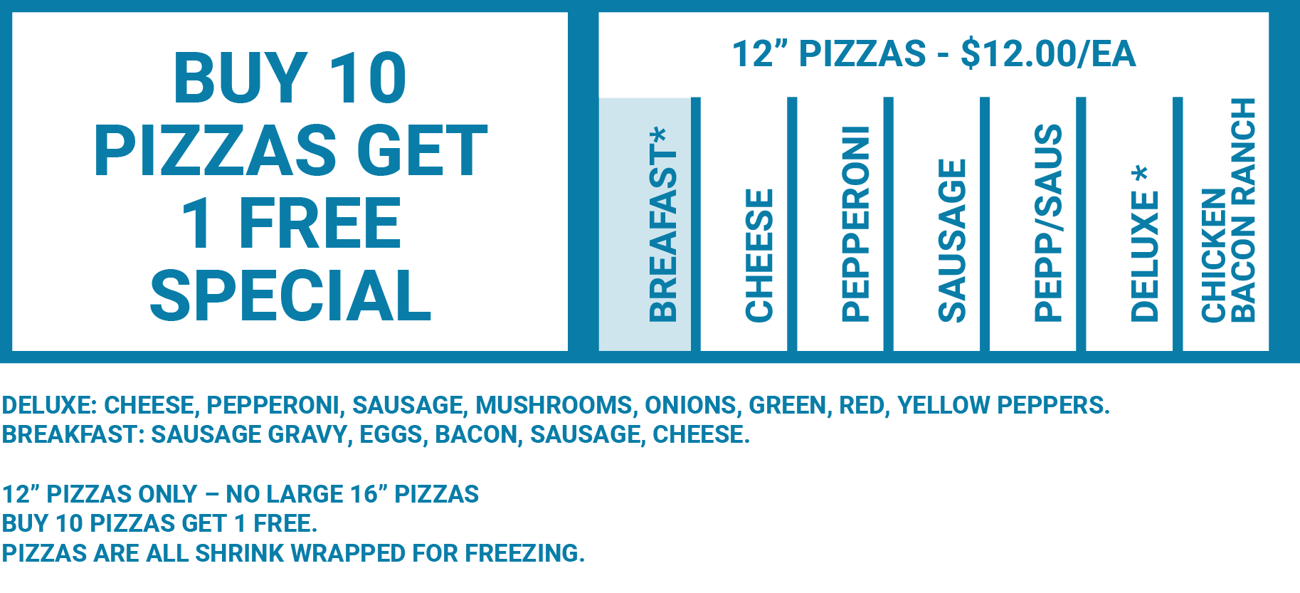 Hope United Church FAMOUS pizzas will be on sale! All pizzas will be made fresh and packaged. We will again be offering the deluxe pizza option with sausage, pepperoni, mushrooms, onions, green, red, yellow peppers. 12" PIZZAS ONLY – NO LARGE 16" PIZZAS. This is one of our BIGGEST fundraisers that helps support activities at Hope United Church.